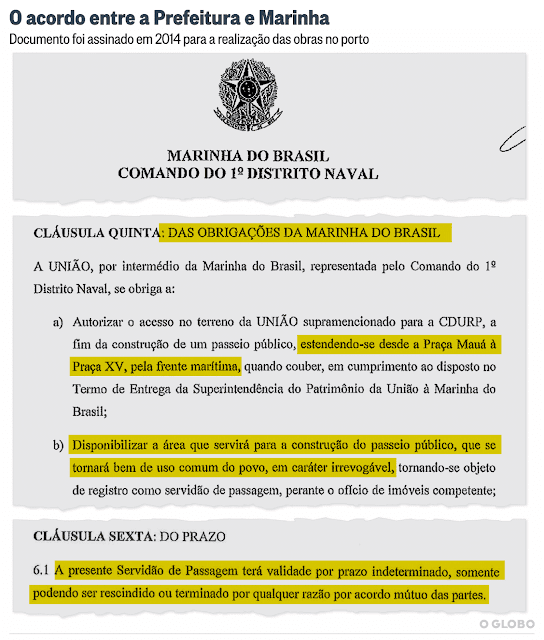 Quanto à polêmica sobre a área ter sido cedida provisoriamente, ou não, a considerar o trecho do acordo (contrato?) celebrado entre a Prefeitura e a Marinha, mostrado pelo jornal O Globo, a perenidade do espaço conquistado para o público é duvidosa: uma cláusula disponibiliza “a área que servirá para a construção do passeio público, que se tornará bem de uso comum do povo, em caráter irrevogável” na forma de uma servidão de passagem; outra cláusula, ao mesmo tempo, determina que a servidão de passagem “terá validade por prazo indeterminado, somente podendo ser rescindido ou terminado por qualquer razão por acordo mútuo das partes” (v. imagem no final do post).