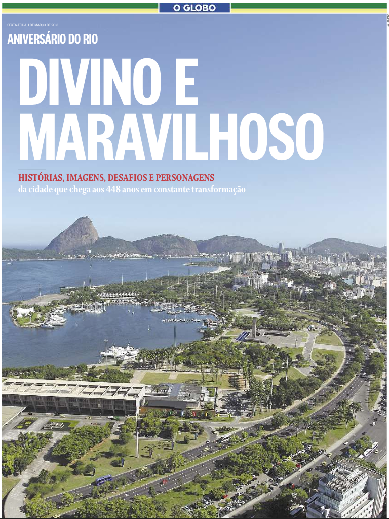 | Imagem que o Jornal O Globo, talvez o mais carioca dos jornais, escolheu para capa do caderno especial publicado no dia do 448º aniversário da Cidade de São Sebastião do Rio de Janeiro. |