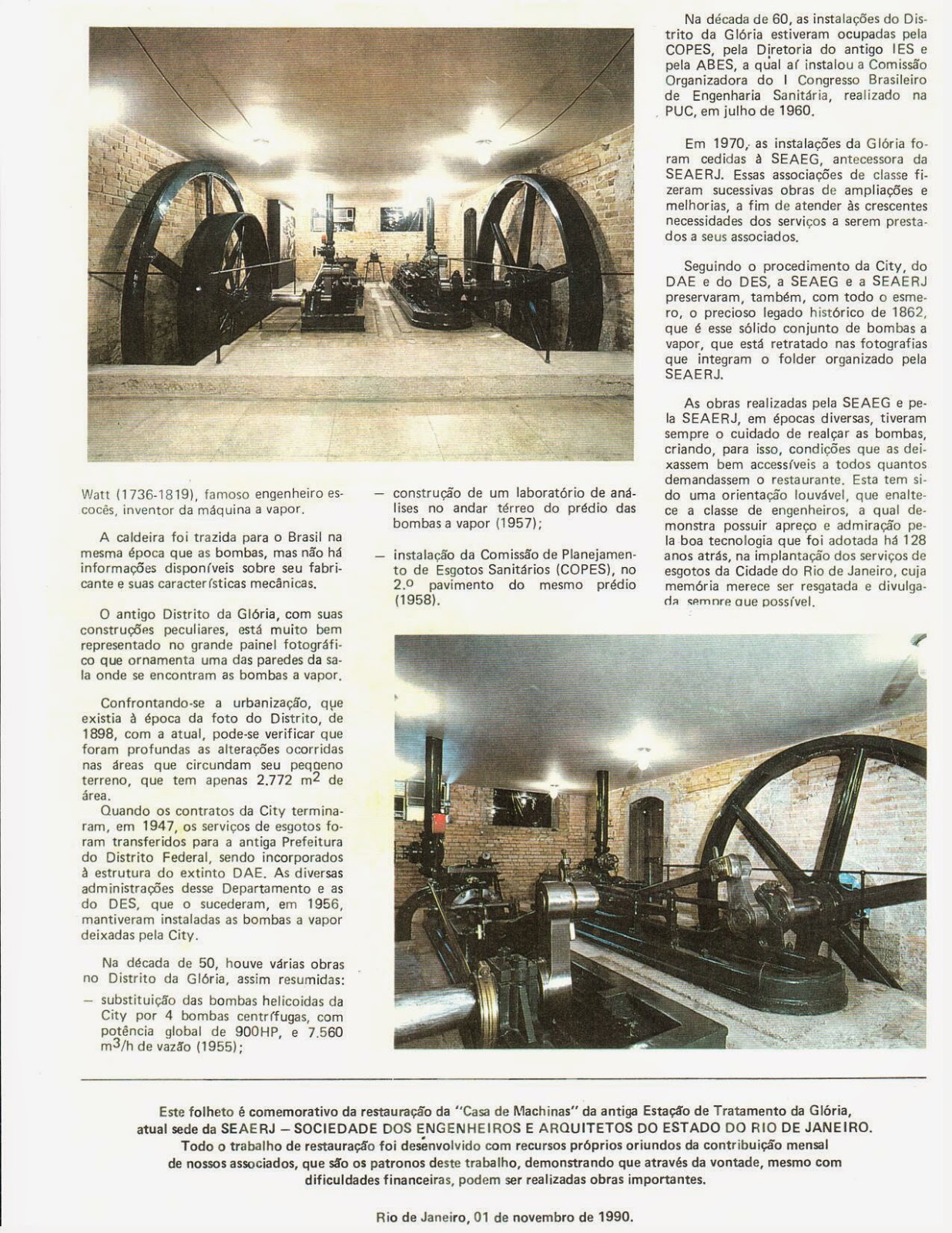 Com bombas a vapor, fabricadas não menos que pela James Watt & Co., ainda podem ser vistas no local, hoje sede da SEAERJ – Sociedade dos Engenheiros e Arquitetos do Estado do Rio de Janeiro.