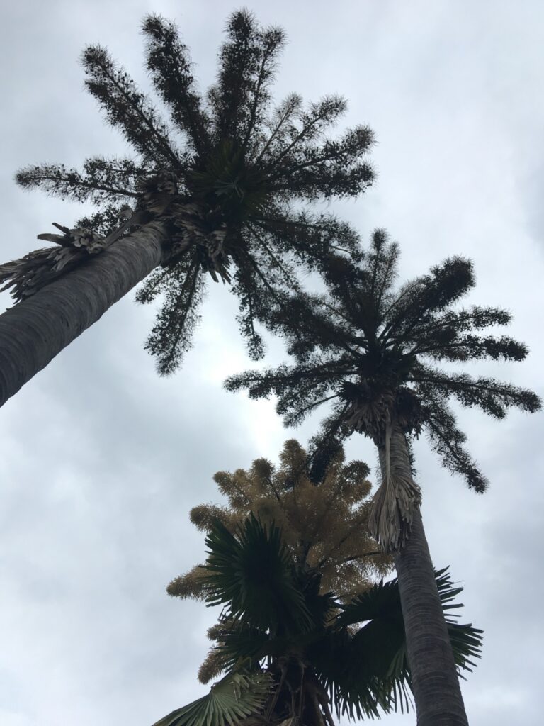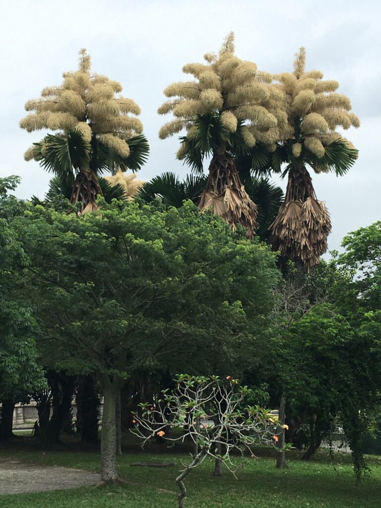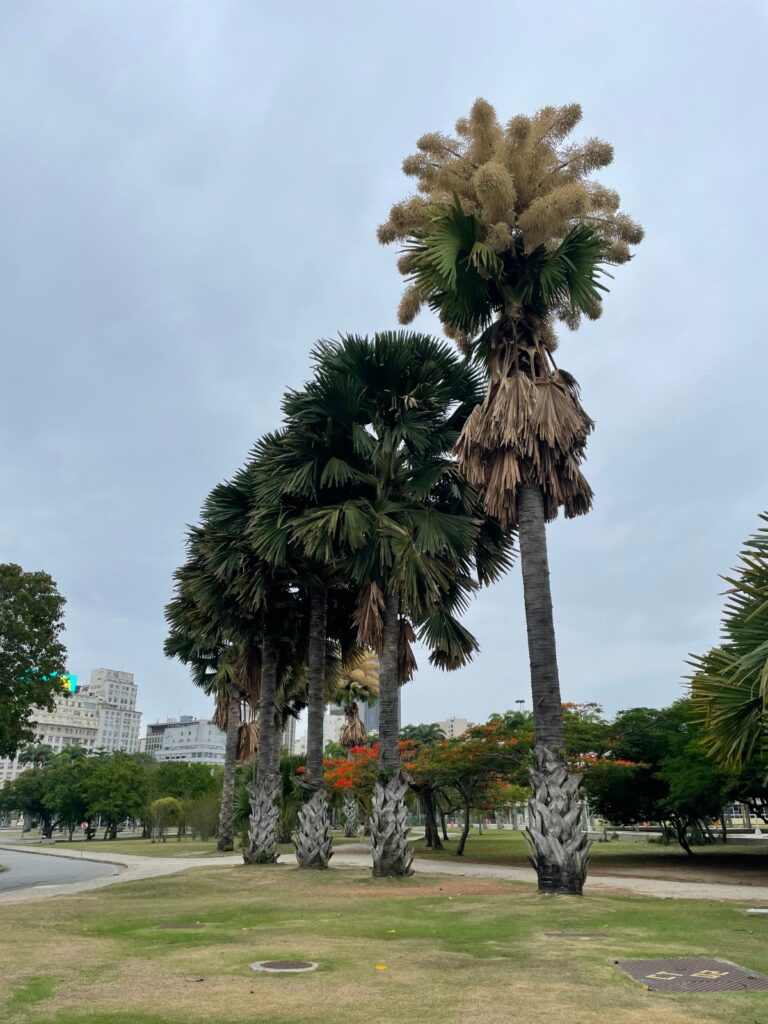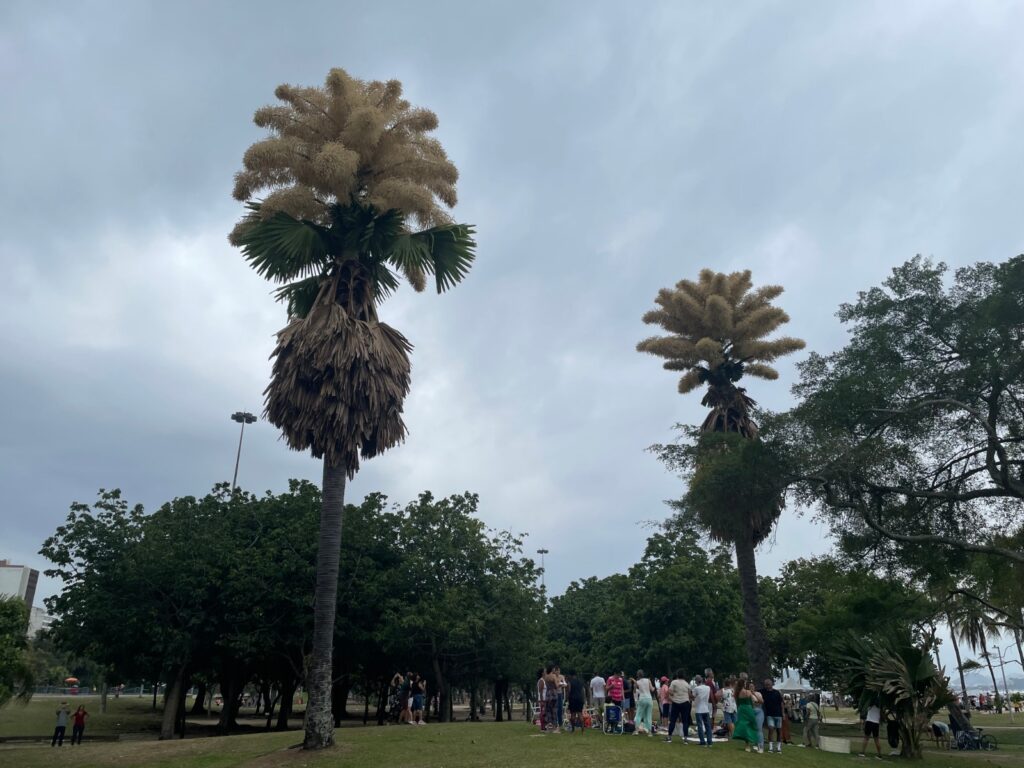 Fig.1 – Dois exemplares de corifas floridos, próximo ao bairro do Flamengo. Foto: Ivete Farah, 2025.