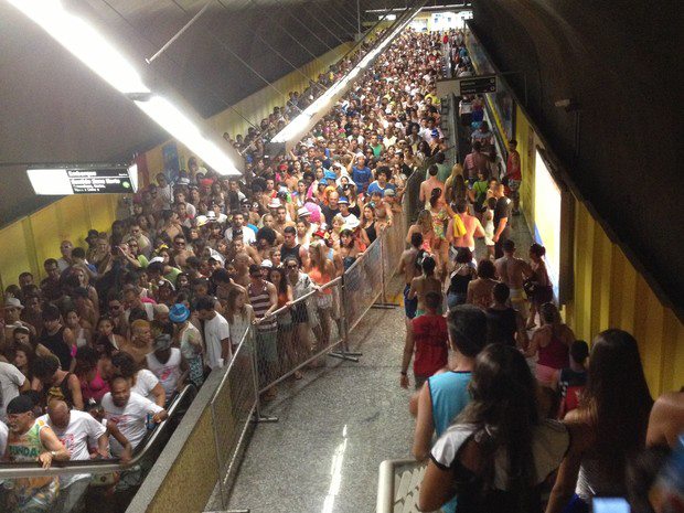 O Urbe CaRioca, por sua vez, questionou em vários posts a opção do governo de esticar a Linha 1, que hoje termina na Praça General Osório, antes de construir a Linha 4 original (além do texto com link acima, v. Mais Metrô 11 e outros de autoria de Miguel Gonzalez) . Por certo o Carnaval não dura o ano inteiro. Ainda assim, a quantidade de blocos e número de foliões que não param de crescer somados à preferência pelos bairros da Zona Sul criam situações inadmissíveis, como a retratada abaixo.