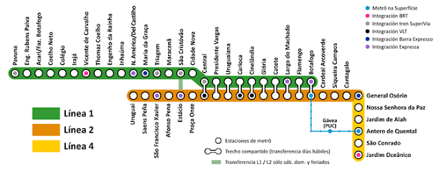 Wikimedia Nota: No dia 25/03 terminou a baldeação que se fazia na Estação General Osório para continuar o mesmo trajeto. Os trens da Linha 1 passaram a seguir direto para a Barra da Tijuca. |