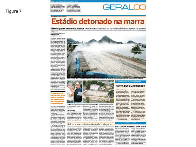 Mas os crimes contra o patrimônio público não pararam por aí. Uns dois anos antes dos Jogos Pan-americanos de 2007, o governo do estado assina um 3º aditivo ao contrato de “permissão de uso” onde se compromete a adequar o Estádio para o evento. Surge então uma estranha estória acerca da arquibancada baixa (bloco 2), originalmente projetada para receber garagens de remo: sob a alegação de que a mesma não atendia aos “requisitos da ODEPA – Organização Desportiva Panamericana” encomendam um “relatório técnico” fajuto para condenar a arquibancada existente e justificar sua demolição para construir outra no mesmo lugar com altura elevada em 1,5 metros. A encenação chegou a ser denunciada ao Ministério Público por Zezé Barros, filho do arquiteto que projetou originalmente o estádio. No dia previsto para a implosão do prédio, um oficial de justiça comparece ao local com uma liminar em mãos para suspender a demolição, mas é solenemente ignorado pelo procurador-geral do estado que, por telefone, ordena prosseguir com a implosão (Fig. 7). Mais uma vez fica patente a mesquinha cumplicidade do poder público em satisfazer interesses privados em detrimento do interesse publico. O “circo de horrores”, porém, continuava…