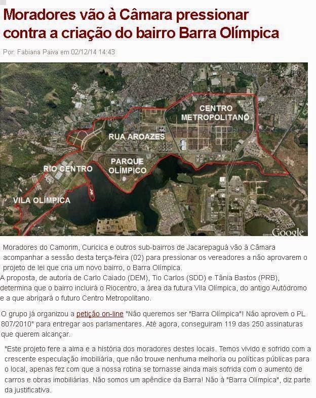 Maracanã (bem cultural tombado, teve a cobertura original demolida com autorização do IPHAN), o caso do Engenhão (recém-aberto), Parque Olímpico, falsa Linha 4 do Metrô, Zona Portuária sem habitação, Parque Ecológico mutilado, Marina da Glória outra vez ameaçada…