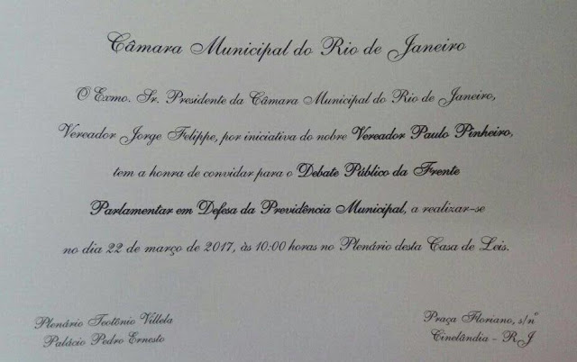 Por outro lado, a Câmara de Vereadores convida para o Debate Público da Frente Parlamentar em Defesa da Previdência Municipal quem será realizado em 22/03/2017, às 10h, no Plenário daquela Casa de Leis.