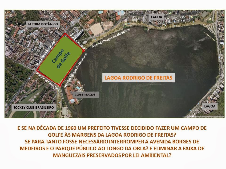 Digamos que, em vez de executar os projetos estabelecidos em administrações anteriores, um gestor nomeado em meados dos anos 1960 houvesse criado condições especiais para a construção de um Campo de Golfe particular às margens da Lagoa Rodrigo de Freitas, Zona Sul do Rio, modificando o projeto do colega que comandou o então Distrito Federal, Carlos Sampaio; digamos que existisse um enorme terreno vazio entre as ruas Jardim Botânico, J. J. Seabra, General Garzon e a beira da Lagoa; que neste local Av. Borges de Medeiros fosse ainda projetada, isto é, que a avenida estivesse quase concluída, faltando construir apenas um trecho entre as ruas J. J. Seabra e General Garzon; e também que na parte do terreno mais próxima da água lagoa existisse uma faixa de manguezais protegidos pelas leis de meio ambiente destinados a integrar uma Área de Proteção Ambiental, onde era proibido construir.