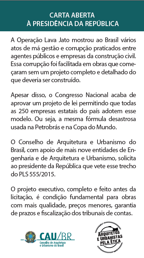 O Conselho de Arquitetura e Urbanismo – CAU, com o apoio de nove entidades de Engenharia, Arquitetura e Urbanismo, publicou Carta Aberta àPresidência da República pedindo veto aos pontos da Lei das Estatais que previam a possibilidade de essas empresas contratarem obras sem projeto. Segundo o CAU trata-se da “mesma fórmula desastrosa usada a Petrobrás e na Copa do Mundo”.
