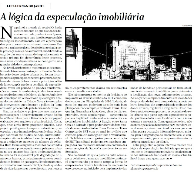 No dia 08 deste mês foi publicado no jornal O Globo mais um importante artigo do professor e arquiteto Luiz Fernando Janot.