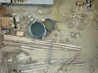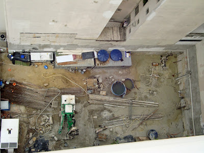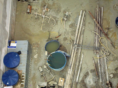 O tratamento que estão dando para o problema é o bombeamento de cimento, através de uma sonda (Foto 2), para o subsolo, onde corre o lençol freático. Mas a Natureza não aceita, de forma passiva, o ataque humano e tem se rebelado, do jeito que pode, jogando o cimento, com água subterrânea, de volta para a superfície. A situação do canteiro de obras é lamentável – um mar de cimento e água – conforme as Fotos 3, 4 e 5. As Fotos 6 e 7 mostram o canteiro de obra, em sua totalidade, com e sem zoom, respectivamente.