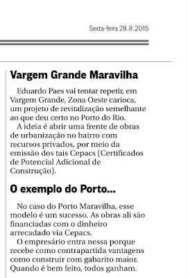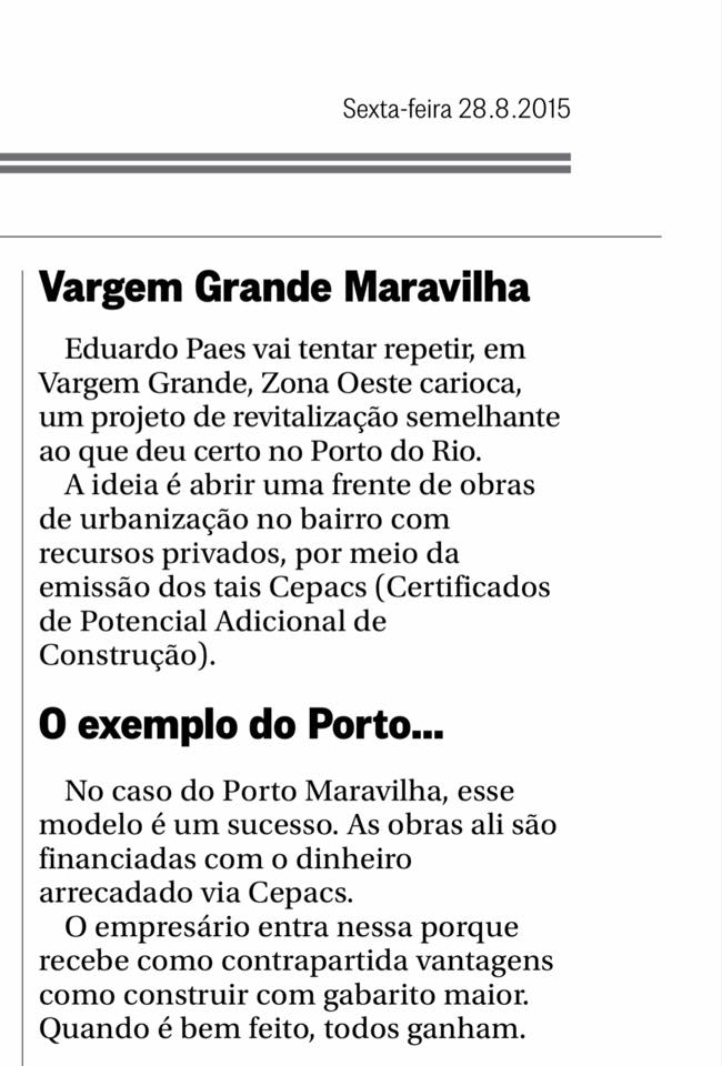 A nota publicada na coluna do prestigioso jornalista Ancelmo Góis em 28/08/2015 informa que a Prefeitura pretende repetir em Vargem Grande o “projeto de revitalização semelhante ao que deu certo no Porto do Rio”.