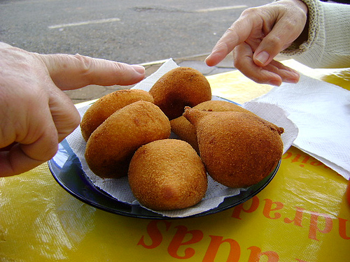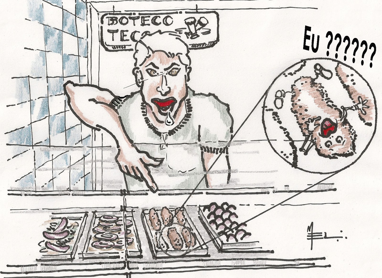 “É o seguinte, doutor: de manhã cedinho pego todos os salgadinhos da véspera que sobraram, amasso, misturo bem, enrolo, passo no ovo e na farinha de rosca, e frito.