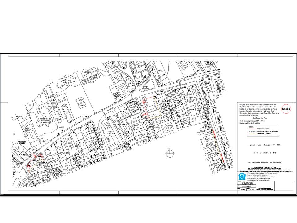 Art. 1º – Fica aprovado o Projeto de Alinhamento 12.364, para modificação dos alinhamentos da Rua São Clemente, na esquina com a Rua da Matriz e no trecho compreendido entre as Ruas Martins Ferreira e Conde de Irajá, e da Rua Sorocaba (lado par), entre as Ruas São Clemente e Voluntários da Pátria, em Botafogo – IV R.A.