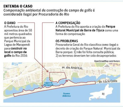 O Campo de Golfe dito olímpico, nada mais do que um gigantesco projeto imobiliário que teve com pano de fundo a alegada necessidade do equipamento para as Olimpíadas, voltou às páginas da grande imprensa por um aspecto inesperado: a possível irregularidade no pagamento de uma licença ambiental questionada pelo Ministério Público do Rio de Janeiro em ação de improbidade administrativa.