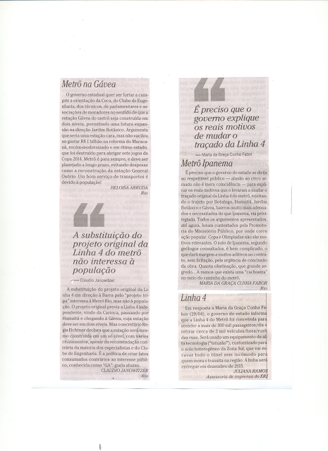 Domingo, no jornal, manchete gigantesca sobre início das obras do Metrô na Zona Sul. O transtorno anunciado desvia a atenção para o ponto principal, já tratado neste Urbe CaRioca: a mudança no traçado anterior com o abandono da Linha 4, A Verdadeira, e o prolongamento da Linha 1, falsamente chamada de 4 (v. post O Metrô e a Praça). Abaixo, algumas cartas de leitores publicadas no jornal O Globo, e a resposta vazia do Governo Estadual, que não apresenta os estudos urbanísticos para comprovar o que diz, tampouco explica a ausência de licitação para a obra, conforme vários veículos na mídia têm divulgado que ocorreu. Quanto a isto, se verdadeiro bastará para a obra ser embargada.