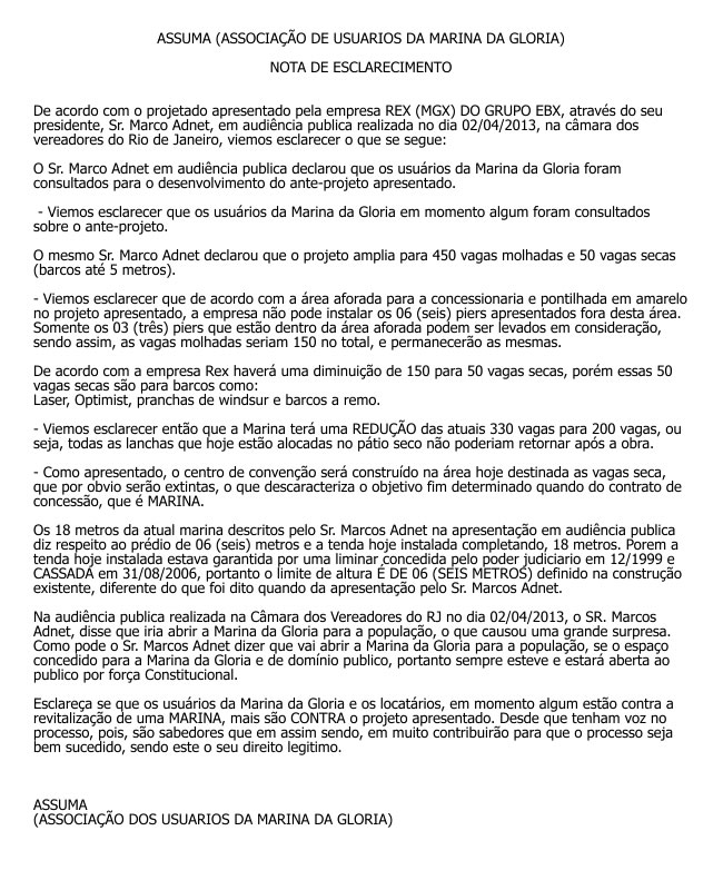 NOTA DE ESCLARECIMENTO DA ASSOCIAÇÃO DE USUÁRIOS DA MARINA DA GLÓRIA – ASSUMA |