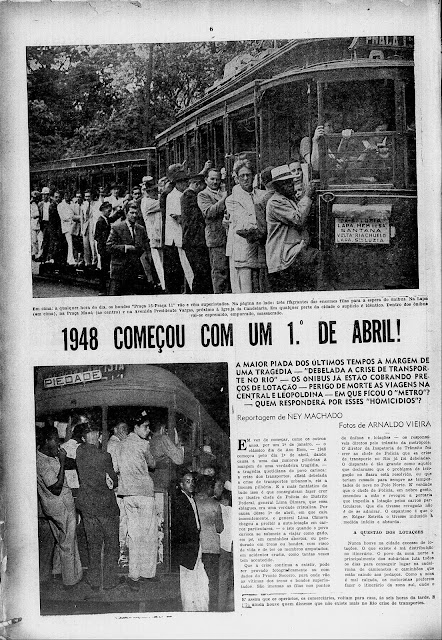 No seu post mais recente – Rio Transit Crisis – 1948– o autor comenta e reproduz artigo publicado na Revista da Semana de 24/01/1948 – digitalizada e disponível nos arquivos da Biblioteca Nacional -, que conta a história da “maior piada dos últimos tempos”, não sem razão sobre os problemas com a mobilidade urbana no Rio de Janeiro (ou, a sua ausência): “Debelada a crise de transportes no Rio”. O título da reportagem de Ney Machado: 1948 Started on April 1st!