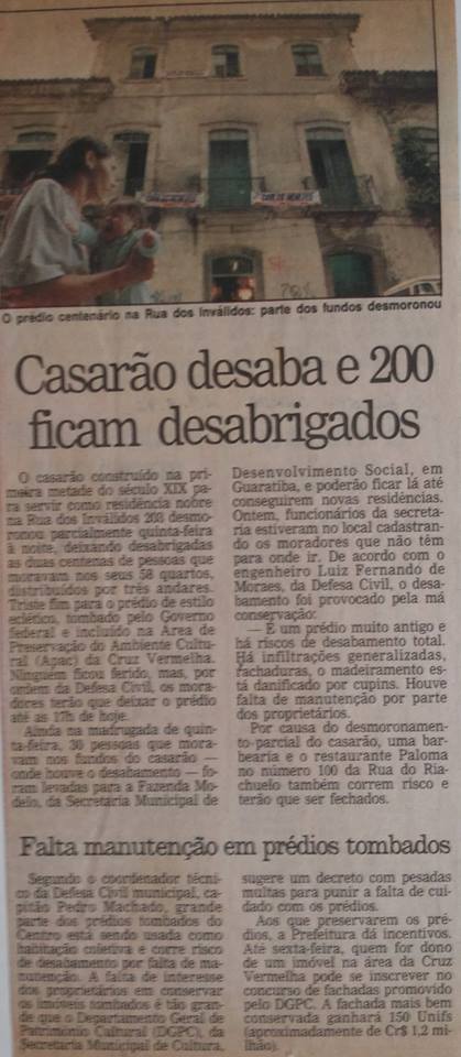 No início dos anos 90 o Jornal O Globo informava o desabamento da área interna de um velho casarão situado na esquina da Rua do Riachuelo com Rua dos Inválidos, no Centro do Rio. Tratava-se de um dos últimos exemplares da arquitetura portuguesa de residência coletiva ainda ocupada com essa função em pleno século XX. Transformou-se num grande cortiço com população que superava 200 pessoas divididas entre os mais de 50 quartos, tal era o porte da construção. No andar térreo funcionavam barbeiro, vendas de frutas, sala de bilhar, etc.