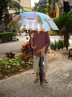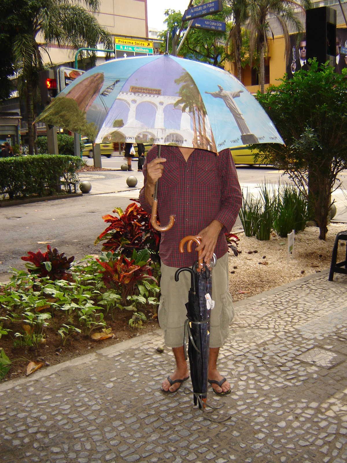 Em um dia quente, lá estava ele de manhã com os vestidinhos de praia multicoloridos. Poucas horas depois volto à rua e cai uma pancada de chuva grossa, refrescante, a chuva de verão que alivia a Urbe CaRioca, e… Quem surge? Ele mesmo, carregado de guarda-chuvas pequenos, grandes, coloridos, alguns com imagens do Cristo Redentor.