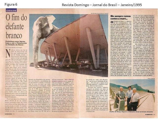 Durante a década de 80 e inicio dos anos 90 do século passado, o Estádio de Remo da Lagoa voltou a ter um uso, não apenas para assistência de regatas, mas como um centro multidisciplinar de iniciação desportiva. A SUDERJ desenvolvia no local o PID – Programa de Iniciação Desportiva, com mais de 2.500 crianças e adolescentes frequentando diariamente uma área que sempre foi pública e aberta a todos. Sem explicação alguma, porém, o programa foi cancelado. O Estádio passou anos abandonado, sem manutenção. Chegou a ser chamado de “elefante branco” na imprensa (Fig. 6). Em 1997, apesar da vigência da Lei 905 que disciplinava o uso do estádio, o então governador Marcelo Alencar resolveu efetuar uma estranha “permissão de uso”, sem licitação, para uma desconhecida empresa chamada Glen, cujo sócio minoritário era ligado à família Marinho e a participação majoritária estava nas mãos de outra empresa chamada Pliwel Sociedad Inversora, sediada no Uruguai.