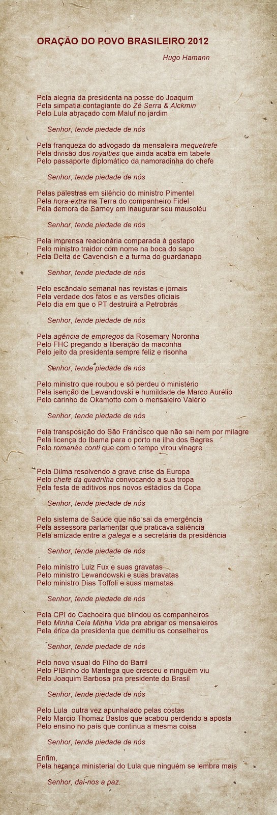 ORAÇÃO DO POVO BRASILEIRO, por Hugo Hamann [A-] [A+] Se interessa ao Brasil, interessa à Cidade de São Sebastião do Rio de Janeiro.Blog Urbe CaRioca Blog Consolide ORAÇÃO DO POVO BRASILEIRO 2012 Hugo Hamann Relacionado Compartilhar