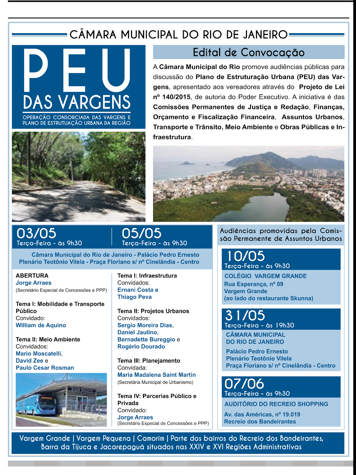 A 3ª VERSÃO DO PEU DAS VARGENS vai juntar, na mesma lei, duas propostas distintas: uma para aprovação da OUC, certamente a ser entregue ao mesmo grupo, e a outra para “requentar” o PEU DAS VARGENS aprovado em 2009, suspenso para receber a revisão agora apresentada à Câmara de Vereadores.”