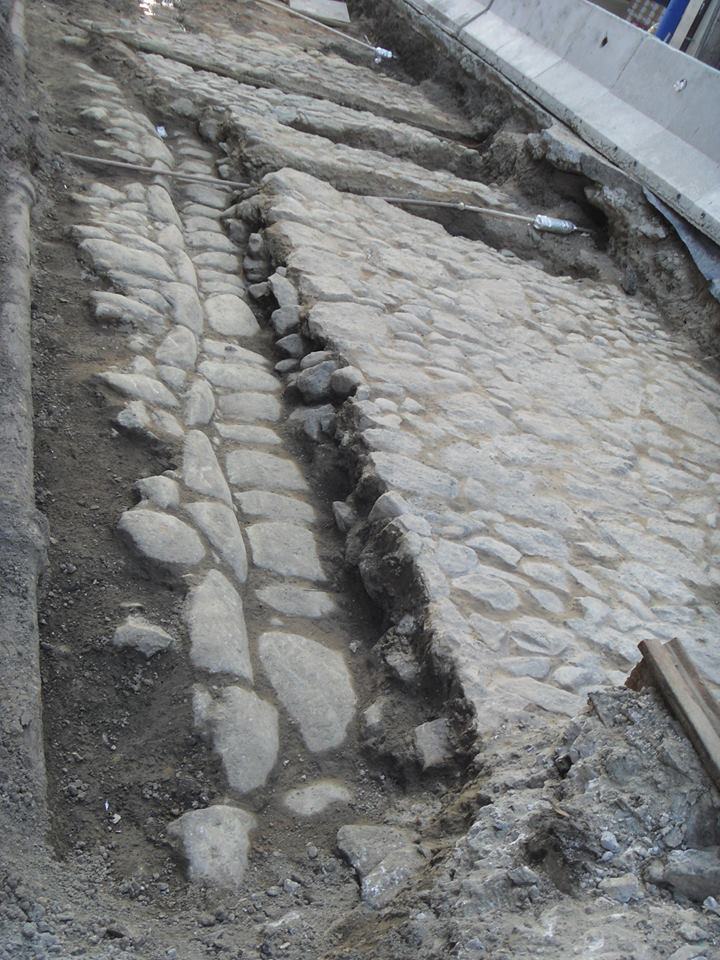 As obras do VLT no Centro do Rio de Janeiro, ao longo da Avenida Rio Branco e das ruas da Constituição e Sete de Setembro, nos revelaram vestígios arqueológicos que retratam um pouco do passado histórico da cidade, que este ano está completando 450 anos, quase meio século. O que está chamando a atenção dos mais curiosos ou estudiosos do assunto, após a descoberta dos trilhos de bondes, é o calçamento de pedra em pé de moleque, que na Rua da Constituição prolonga-se por quase toda a via. Porém, pelas últimas imagens registradas pelo amigo Marconi observa-se que a empreiteira contratada pela prefeitura já está na fase de concretagem do trecho dessa rua, soterrando-o de vez. Esse calçamento só será lembrado pelos transeuntes e curiosos pelos registros fotográficos.