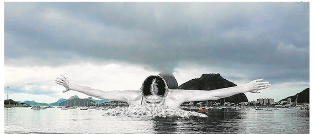 Pela foto divulgada no jornal, a imagem do o terceiro atleta – uma nadadora de nado borboleta – é muito bonita. Estruturas metálicas não aparecem. No ângulo mostrado, o painel esconde o Pão-de-Açúcar, o que nada tem de maravilhoso.