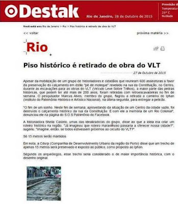 A notícia de violência contra o Patrimônio Cultural da Cidade, relatando-se que uma rua de pé-de-moleque foi destruída por tratores para dar passagem ao futuro Veículo Leve sobre Trilhos (VLT) e que irá transitar no Centro do Rio chocou os cariocas.